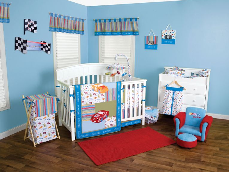 Trend Lab Nascar 3 Piece Crib Bedding Set Description : Trend Lab's NASCAR Crib Bedding Collection will bring full-speed racing enthusiasm straight to your nursery! The 3-Piece Crib Bedding Set features race cars and checkered flags, tire dots and tire tread stripes printed in cornflower and sky blue, red hot, mango orange, olive green and charcoal gray. The deep primary color palette and oversized appliques add the perfect combination of trend and excitement to your little rookie's NASCAR nursery! The quilt measures 32"x 42" and features revved up race car appliques set against multiple patches including both solids and scatter prints. The cotton prints feature race cars and checkered flags, tire dots and tire tread stripes in rich colors of cornflower blue, sky blue, red hot, mango orange, olive green and charcoal gray. A NASCAR logo print frames the quilt giving it the official NASCAR stamp! Use your quilt as a wall print by taking advantage of the rod pocket featured on the backside of the quilt. Tire dot scatter print sheet features 8" deep pockets and fits a standard 52" x 28" crib mattress. Elastic around the entire opening ensures a more secure fit. Box pleat crib skirt with 12" drop features the tire tread stripe and tonal blue NASCAR logo print accented with an olive stripe.